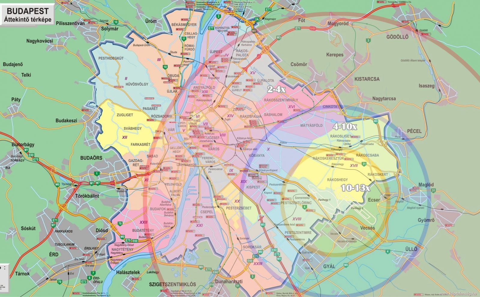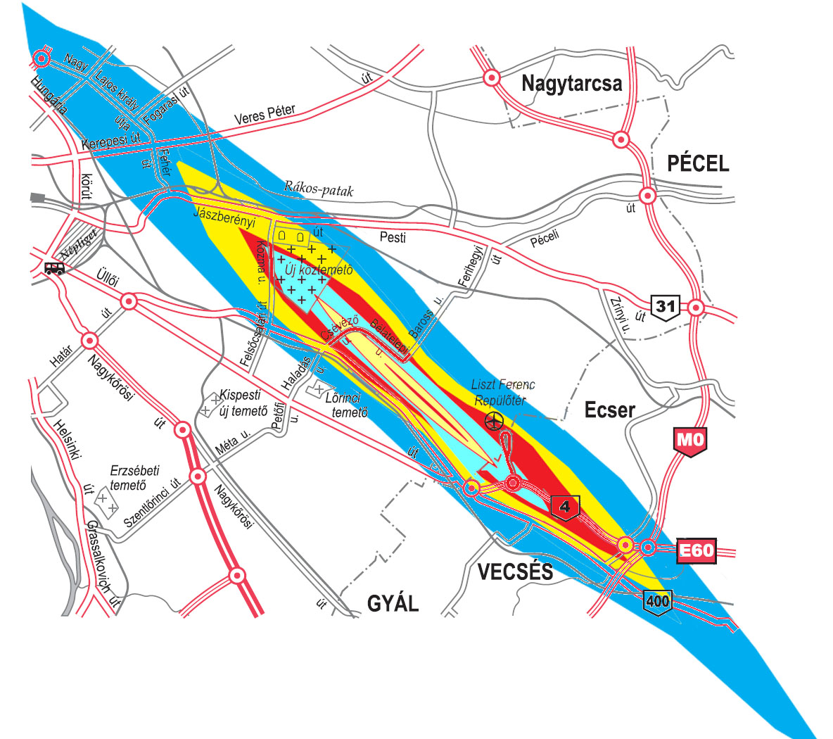 ZAJSZENNYEZÉS. 2. Alábbi térkép: A magyar jogszabályok által meghatározott zajcsökkentő zónák (homok és világoskék) és az EU által ajánlott zónák (piros, sárga és kék). Forrás: Kulturált Légi Közlekedésért Egyesület (KLKE / CATA)